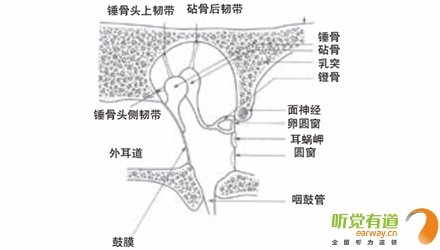 <span style="font-size:16px;"> 中耳結(jié)構(gòu)包括鼓室、咽鼓管、鼓竇和乳突腔四部分。鼓室內(nèi)有聽骨、肌肉、韌帶和神經(jīng)。中耳是換能器,換能是將一種能量形式轉(zhuǎn)換成另一種能量形式,中耳通過鼓膜和聽骨鏈將聲能轉(zhuǎn)換為機(jī)械能,再由鐙骨底板將機(jī)械能轉(zhuǎn)換為內(nèi)耳的液態(tài)能。</span></p><p><span style="font-size:16px;"> 鼓膜是中耳和外耳的分界,呈橢圓形,中間稍向內(nèi)凹陷,色灰白,較透明,與耳道底約呈30°角。鼓膜寬約8mm,高約9mm,厚0.1mm,質(zhì)地韌,其構(gòu)造分三層:外層是皮膚層,中層由淺層的放射狀和深層的環(huán)狀纖維組成,它們使得鼓膜能承受一定的氣壓和水壓并抗感染,內(nèi)層為粘膜層,與鼓室粘膜相連續(xù)。聲音的振動,即聲能,通過耳郭和耳道共振的加強(qiáng),引起鼓膜隨之振動,鼓膜與中耳的錘骨相連,在正常耳,錘骨懸掛在自鼓膜頂端至下2/3處。錘骨柄的尖端將鼓膜頂向中耳,形成錐形鼓膜的頂,稱作臍。自臍向前下達(dá)鼓膜邊緣有一個三角形的反光區(qū),名光錐,是外來光線被鼓膜的凹面集中反射而成。鼓膜下4/5為緊張部,上1/5由于缺乏纖維層而較松馳,稱為松弛部。鼓膜可分為前上、前下、后上、后下四個象限。兒童的鼓膜薄而有彈性,年齡越大,鼓膜越厚且越僵硬。鼓環(huán)將鼓膜固定在某一位置,使其成為在外耳和中耳之間的一層防水防氣的屏障。</span></p><center><span style="font-size:16px;"><img alt="" src="/upfiles/201810080137189845.png" width="440" height="250" /></span></center><p></p><p><span style="font-size:16px;"> 中耳鼓室</span></p><center><span style="font-size:16px;"><img alt="" src="/upfiles/201810080137242362.png" width="440" height="250" /></span></center><p></p><p><span style="font-size:16px;"> 正常鼓膜像(左)</span></p><p><span style="font-size:16px;"> 在中耳腔內(nèi)的聽骨是人體最小的骨頭,分別叫作錘骨、砧骨和鐙骨。這些聽骨由韌帶連接并懸掛起來形成了聽骨鏈。錘骨柄附在鼓膜上,錘骨頭與砧骨頭形成錘砧關(guān)節(jié),砧骨底與鐙骨頭形成砧鐙關(guān)節(jié),鐙骨底板由環(huán)狀韌帶固定在卵圓窗上。聽骨鏈利用杠桿原理使來自鼓膜的機(jī)械能放大,傳遞到卵圓窗。</span></p><center><span style="font-size:16px;"><img alt="" src="/upfiles/201810080137303051.png" width="440" height="250" /></span></center><p></p><p><span style="font-size:16px;"> 聽骨鏈</span></p><p><span style="font-size:16px;"> 咽鼓管是中耳通氣引流的唯一途徑,也是中耳感染的主要途徑。它的一端開口在較高的中耳鼓室腔,另一端開口在較低的鼻咽部,通過咽鼓管在鼻咽部的開口,空氣可從外界直接進(jìn)入中耳腔。咽鼓管平時處于關(guān)閉狀態(tài),能較好的防止細(xì)菌感染,只有在咳嗽、擤鼻涕、打哈欠或吞咽時,咽鼓管才開放。當(dāng)咽鼓管開放時,根據(jù)鼓膜外側(cè)的壓力情況,空氣或者從中耳流向外界,或者從外界流向中耳,使中耳壓力得以平衡。</span></p><p><span style="font-size:16px;"> 更多詳情請登錄m.jjrhy.com</span></p>" />