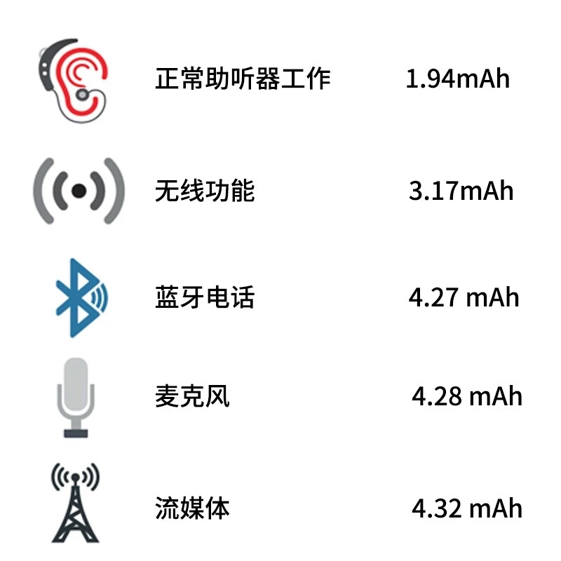 按照耗電量從小到大排列,下圖列出了部分助聽器先進功能對于電量的需求(毫安時)。可以看到,與簡單工作相比,使用先進功能的耗電量急劇上升。所以,如果您使用了助聽器的無線功能,那么電池使用壽命當然會比助聽器僅簡單工作時要短很多。