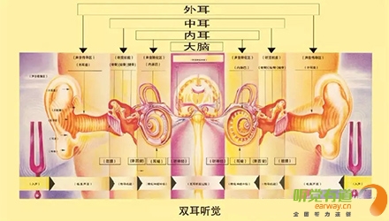 聲音到達兩側耳所經歷的路徑是不同的。信息的交叉與混合出現于相對低級別的聽覺系統。大腦利用雙耳間的時間差、強度差、頻率差和相位差來區別各種聲音。雖然聲音來自兩側,但正常聽力的人們會感受到單一的整體聲音。
