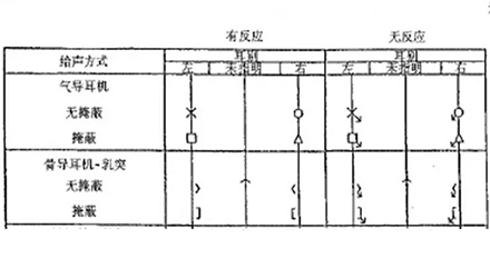聽力圖的畫法自從1943年在C.C.Bunch的著作中出現后,至今沒有改變。通常右耳的測試結果用紅色表示,左耳用藍色。下圖是ASHA(1990)建議使用的各種標記符號,這些符號已在世界各地廣泛使用。