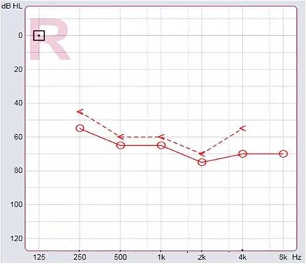 氣骨導一致(≤10dB)且都在正常范圍之外為感音神經性聽力損失。表明聽力下降是由耳蝸、聽神經損傷引起。