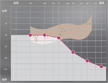 中文漢語元音輔音的頻率及響度有其分布圖,如下圖所示。以陡降型聽力曲線為例,該聽力損失者聽不到大部分的輔音。聽得清不清楚,主要取決于高頻輔音聽得到聽不到。例如該聽力損失者“g”、“ch”聽不到,但“u”能聽到,因此,他會將“姑姑”、“出租”都聽成“uu”。聽不清楚時,再結合口型,前后句的冗余度猜測。猜對則談話繼續,猜錯則打岔。兒童聽力曲線若是如此,長期接收不正確的語音,會出現口齒不清。