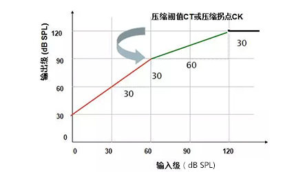 1、壓縮拐點(CK):線性放大與壓縮放大的臨界輸入級,此處為60 dB SPL,即輸入聲強度在60 dB SPL以下時為線性放大,超過60 dB SPL為壓縮放大。①紅線的輸入級范圍為0~60 dB,這段的聲音為線性放大,隨意找一個輸入級,用它對應的輸出級減去輸入級,得出線性放大的增益為30 dB;②當輸入級大于60 dB時,綠色曲線為壓縮放大,輸出與對應輸入的差值不再是30 dB,而是隨著輸入級增加,增益逐漸減小;③當輸出達到最大輸出限制時,輸出不再增大,保持在最大輸出限制位置。